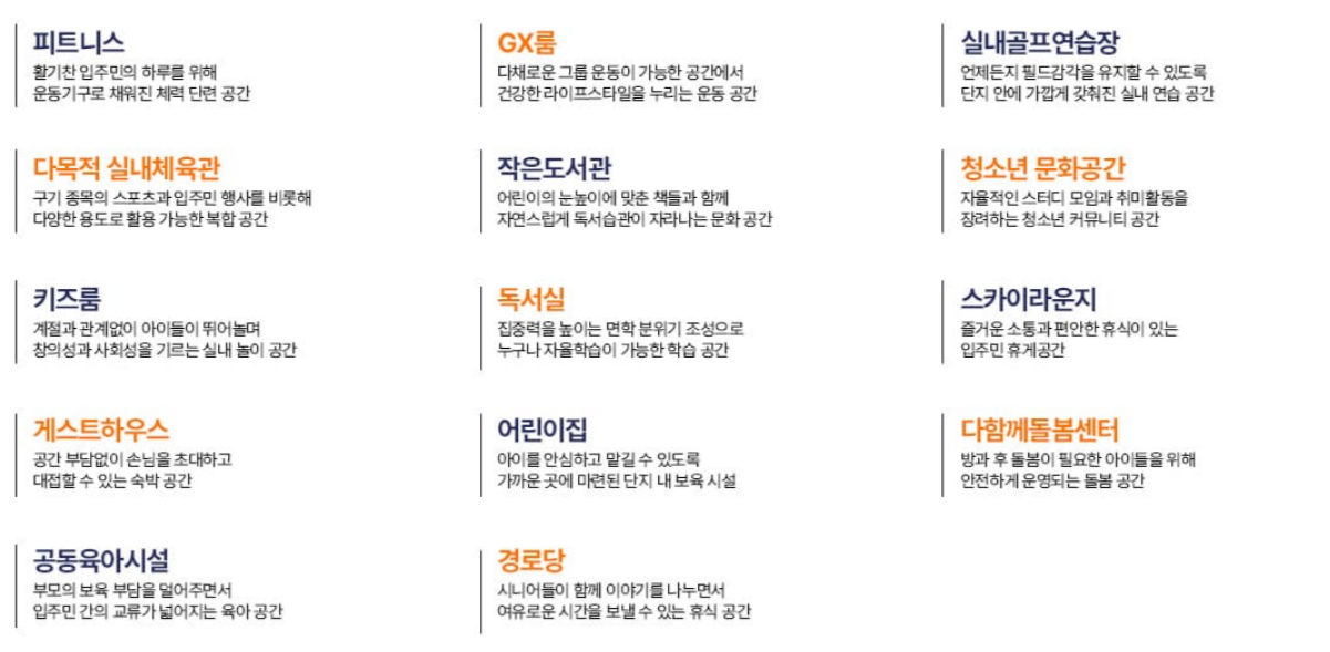 에코델타 아테라 단지는 고품격 커뮤니티도 건축되었는데요. 입주민 건강 관리에 일조하는 운동시설의 경우 피트니스 센터와 GX룸, 실내 체육관이 구성되었습니다. 그리고 작은 도서관과 독서실, 어린이집 등도 건설하였으며, 스카이 라운지에는 여유로운 시간을 보내기 좋은 카페와 게스트 하우스가 구축되었습니다.