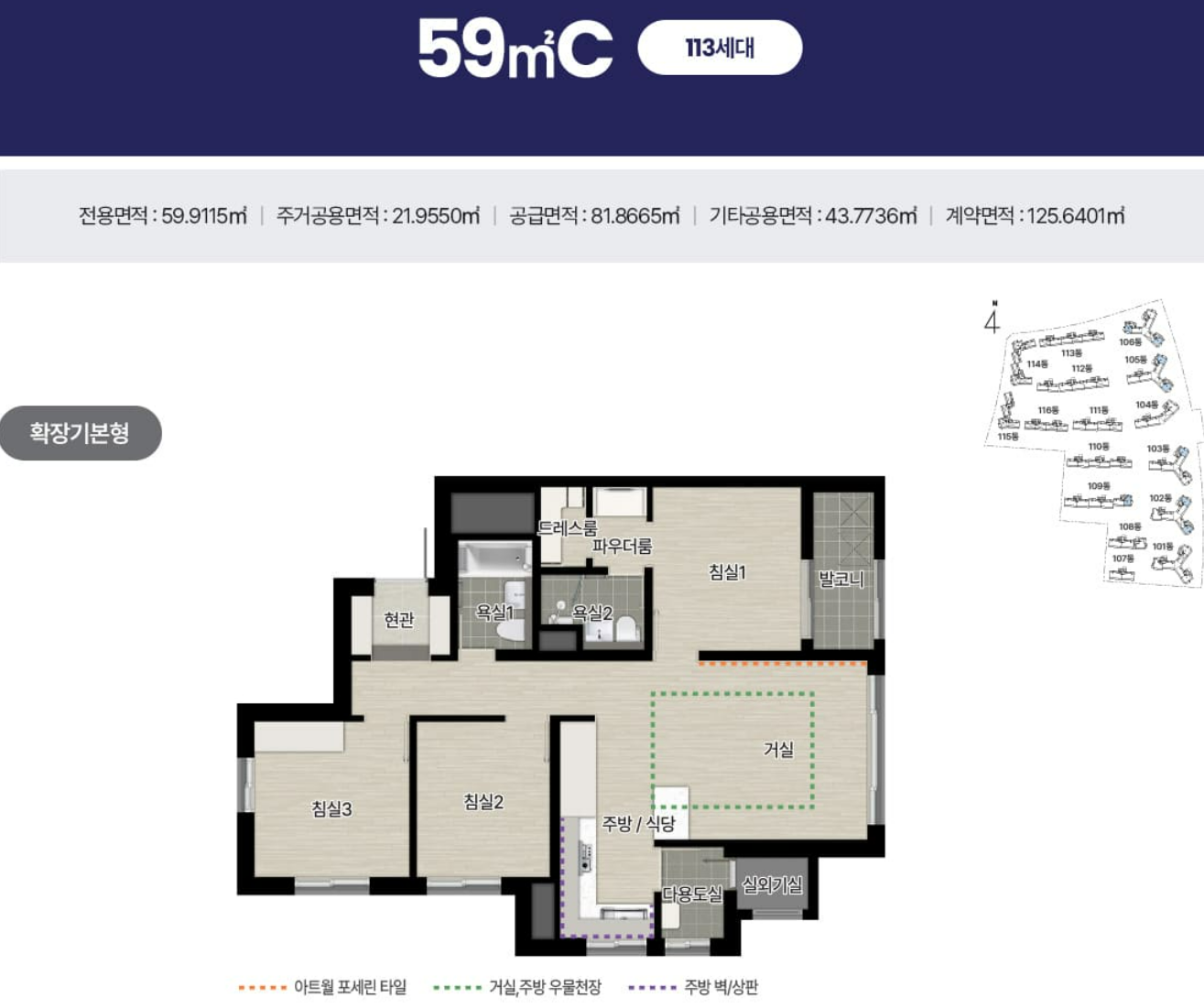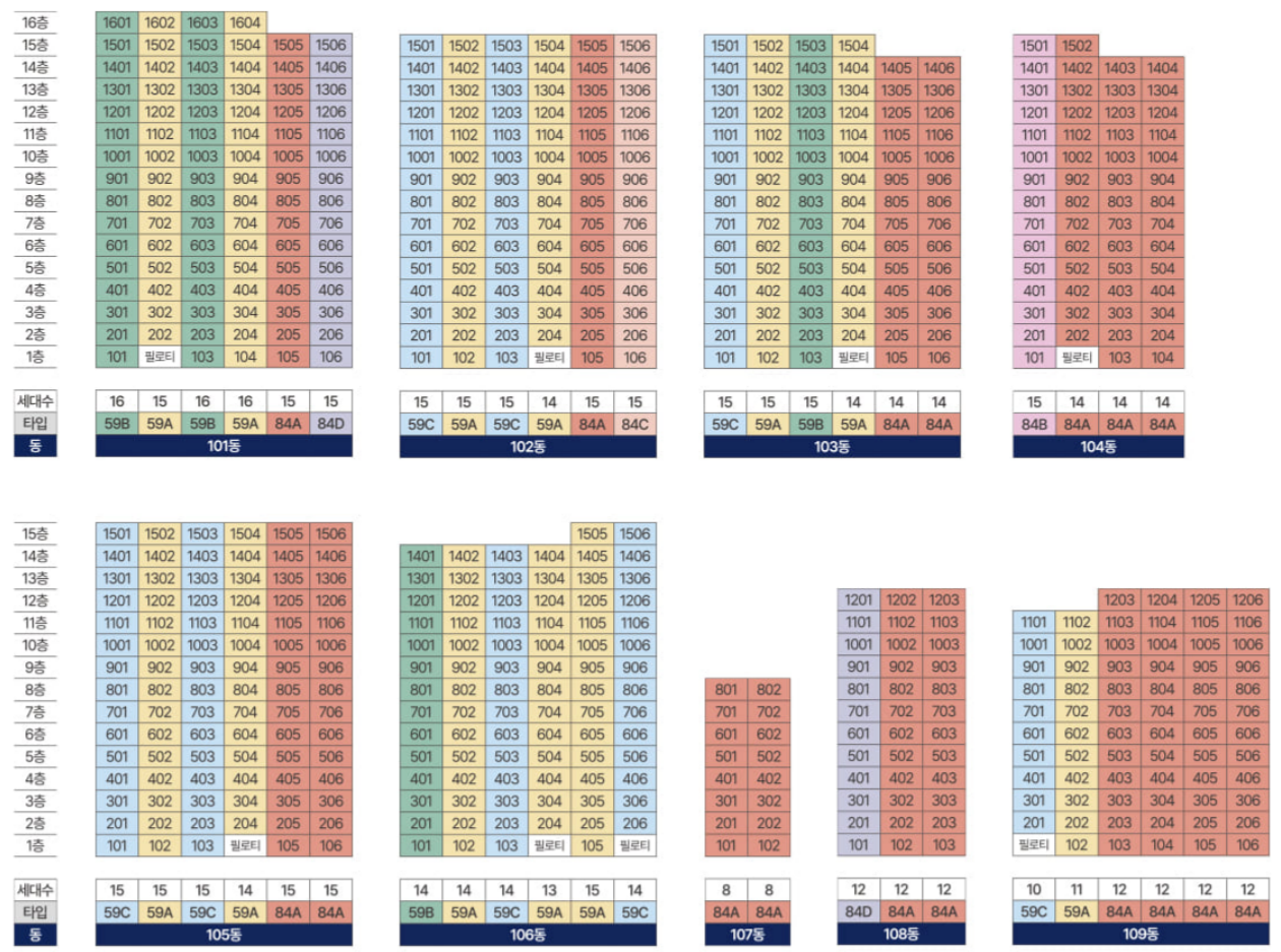 해당 APT의 평면은 실수요층의 니즈를 반영해 중소형 평형 위주로 공급하였는데요. 특히 59타입과 84제곱미터로 설계하였으며, 다양한 유닛으로 세분화했습니다. 그중에서도 59타입은 645세대를 건설하여 주력 상품으로 공급했습니다.