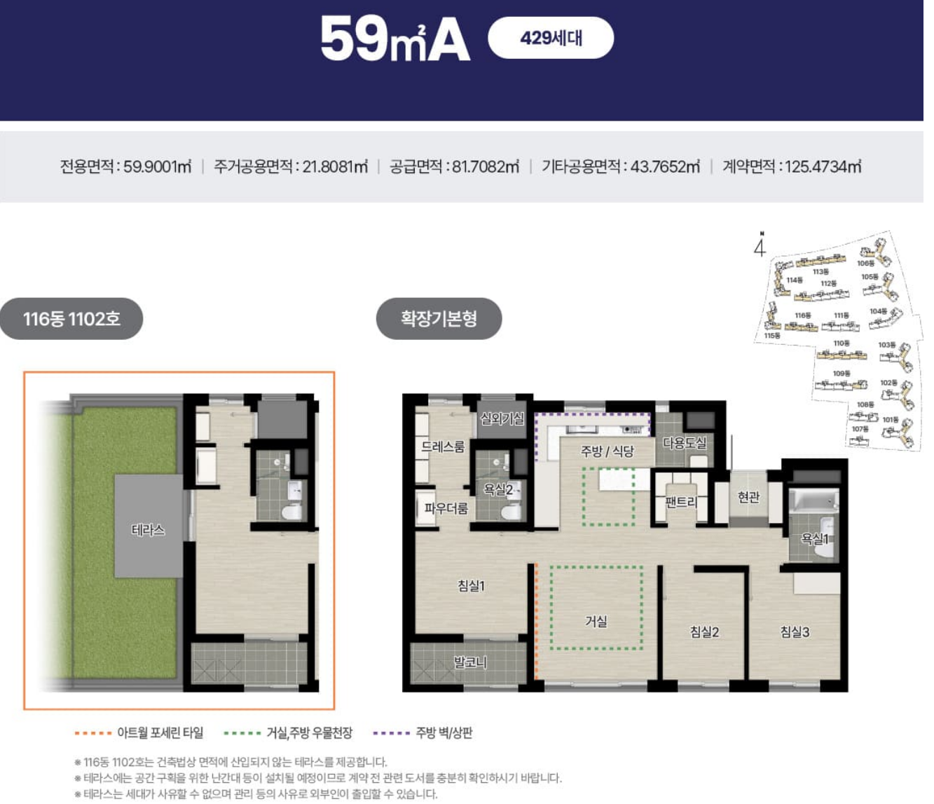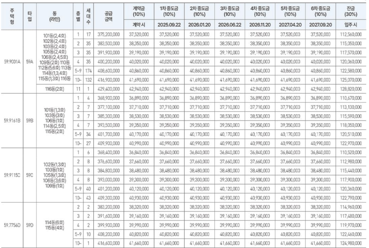 - 다양한 평면: 59㎡는 A, B, C, D 4가지 타입으로, 84㎡는 A, B, C, D, E 5가지 타입으로 구성되어 선택의 폭을 넓혔습니다. 일부 타입(예: 59A, 84A, 84E)에는 테라스가 있는 희소성 있는 평면도 있습니다.
