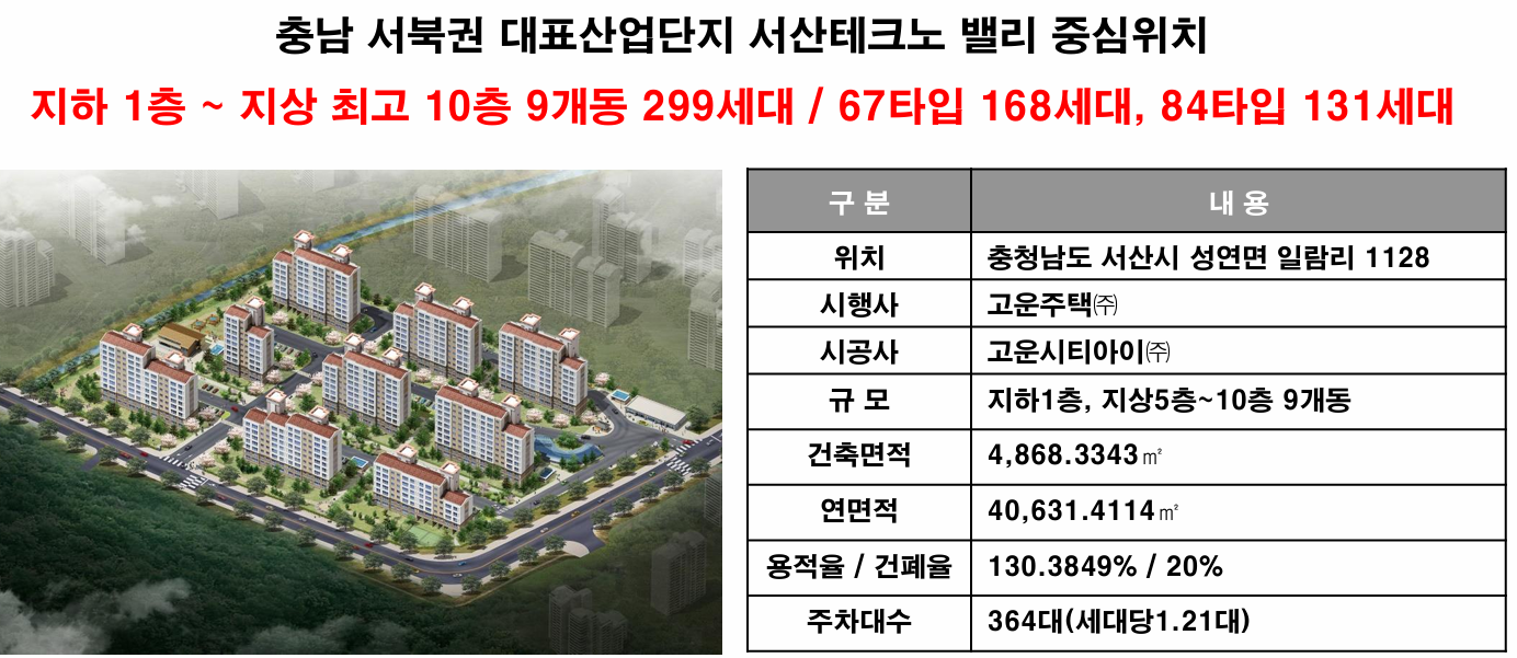 서산 테크노밸리의 중심에서 1억 원대라는 압도적인 가격 경쟁력을 갖춘 '고운하이츠'가 미분양 잔여세대 선착순 동호수 지정 분양을 시작합니다. 즉시 입주가 가능하며, 실거주와 투자 가치를 동시에 잡을 수 있는 절호의 기회입니다.