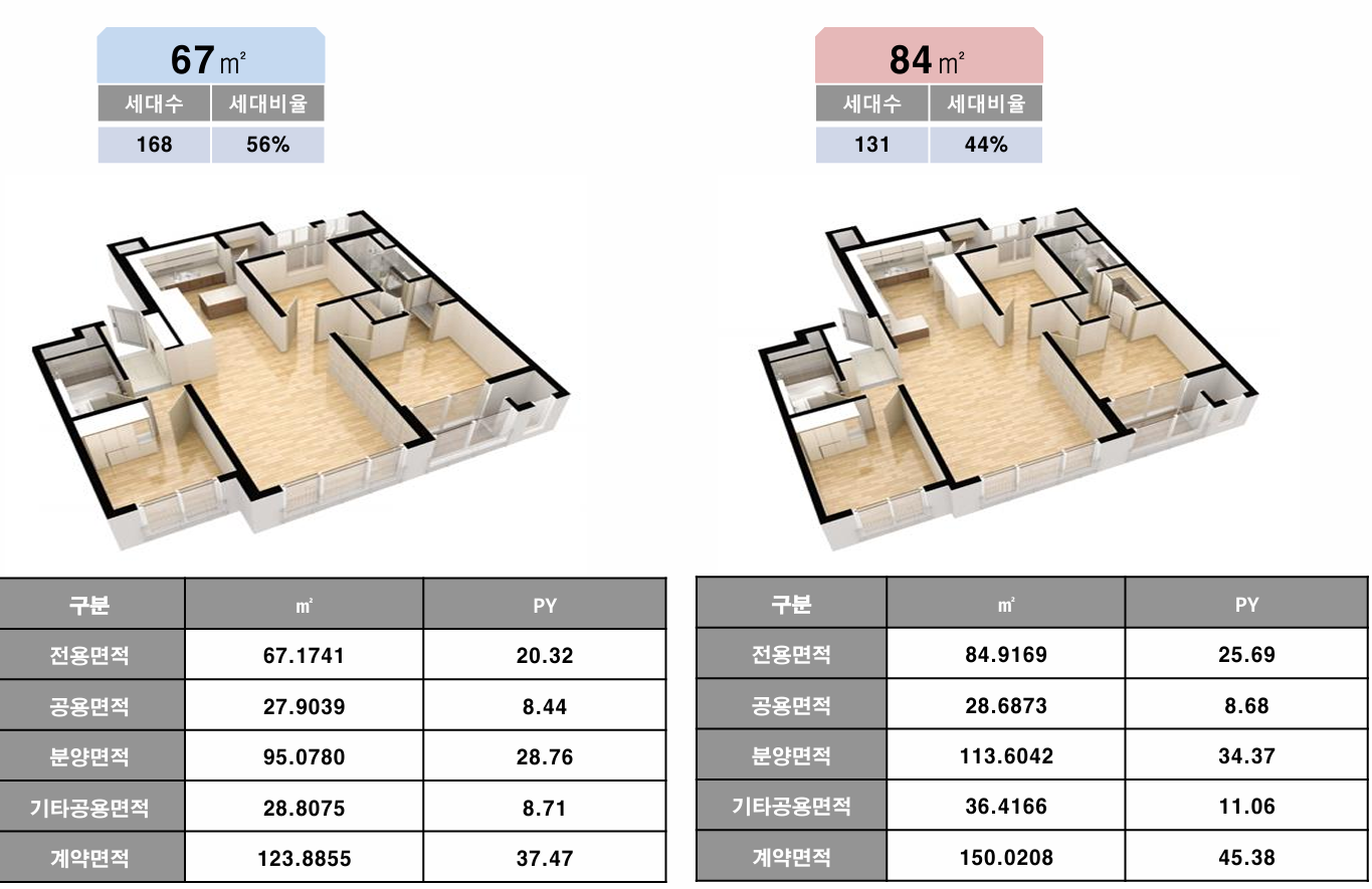공급 타입: * 67㎡ (28평형): 3베이 판상형 (통풍 및 환기 우수)